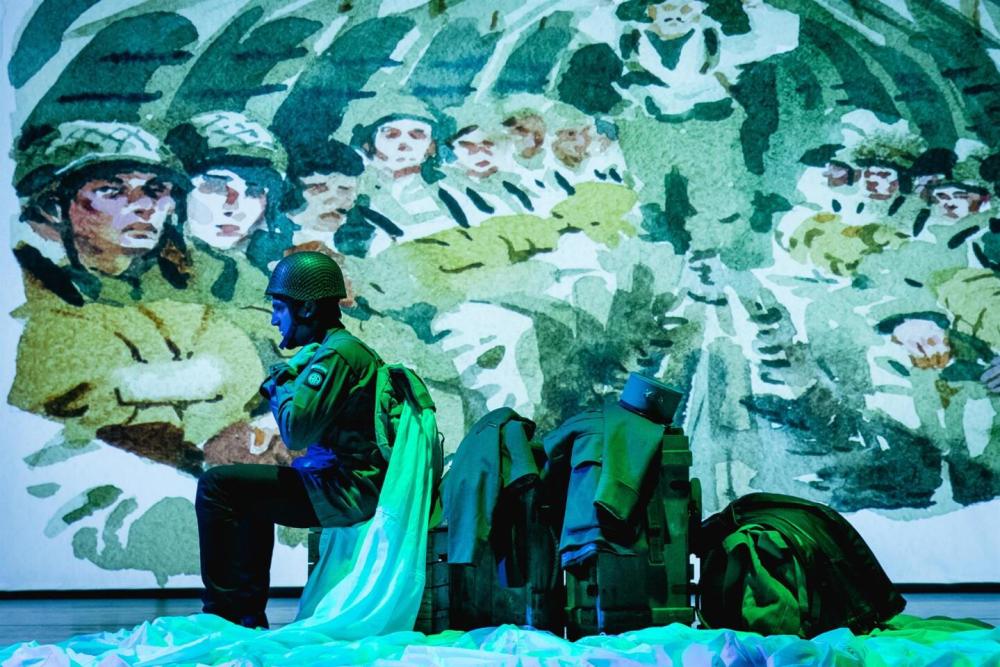 Jouant à merveille de son regard, l’acteur bouleverse par sa présence : la tension se crée dans les silences, les respirations, la manière dont il fait entendre le tumulte des bombes et le bruissement des criquets. On note cependant un travail vocal perfectible ; les changements d’accents ou de tessitures manquent de contraste selon les protagonistes, rendant parfois les transitions un peu uniformes. Mais l’intensité émotionnelle de la performance compense ce défaut.