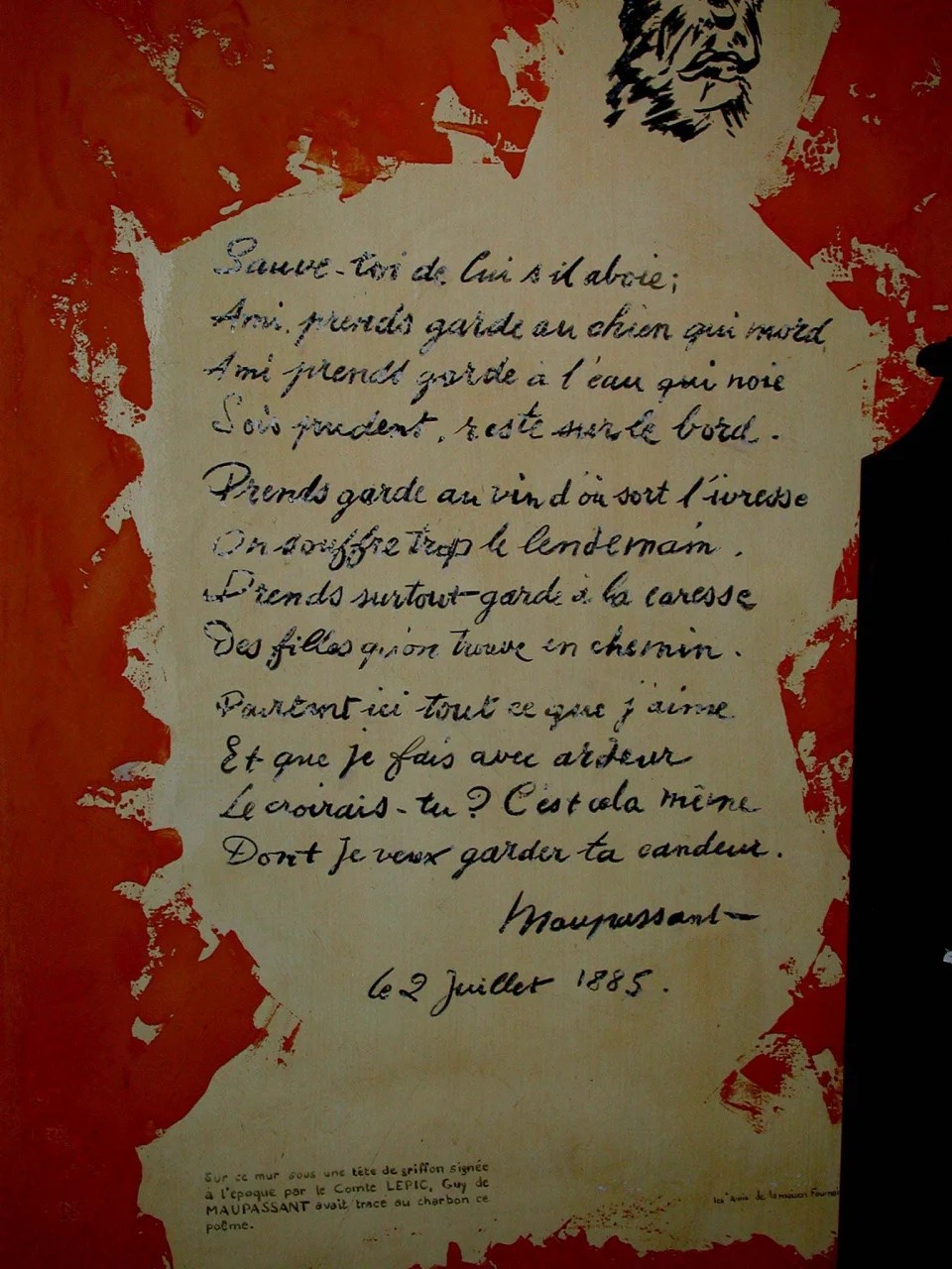 🔵[ANTHOLOGIE] Dans les années 1870-1880, un restaurant appelé la Maison Fournaise accueille les plus grands artistes du XIXe : Claude Monet, Edgar Degas, Auguste Renoir… Mais aussi Guy de Maupassant. Le romancier a d’ailleurs écrit un poème sur le mur du hall d’entrée, Sauve-toi de lui…